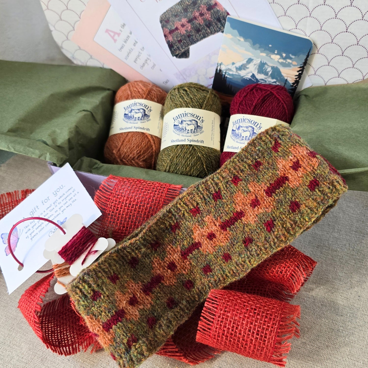 - The Yarn - Jamieson's of Shetland Spindrift in three coordinated colors of the season for your enjoyment. 100% fine Shetland wool. Each skein contains 115 yds of fingering weight, woolen-spun yarn, perfect for stranded colorwork.