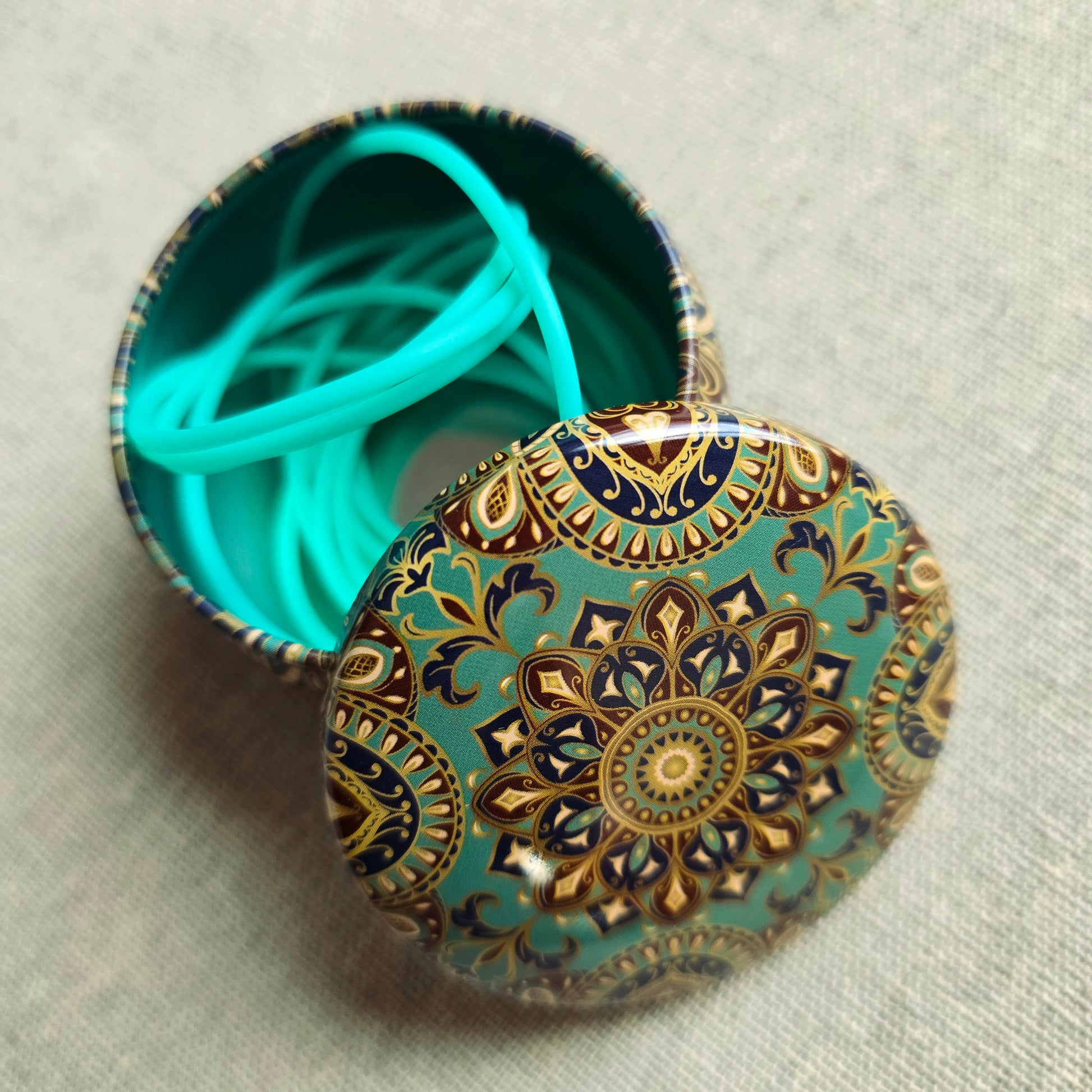 Eighty inches of barber cord packed in a lovely tin. Thread barber cord through live stitches when trying on a garment in progress... they need never fall off the needles again.
