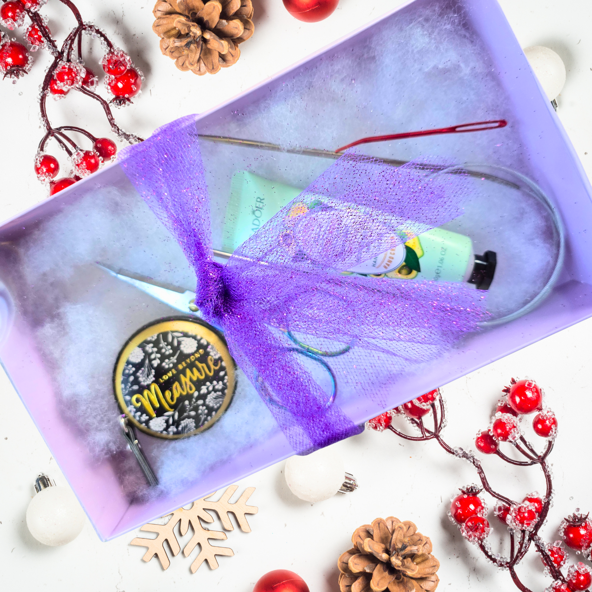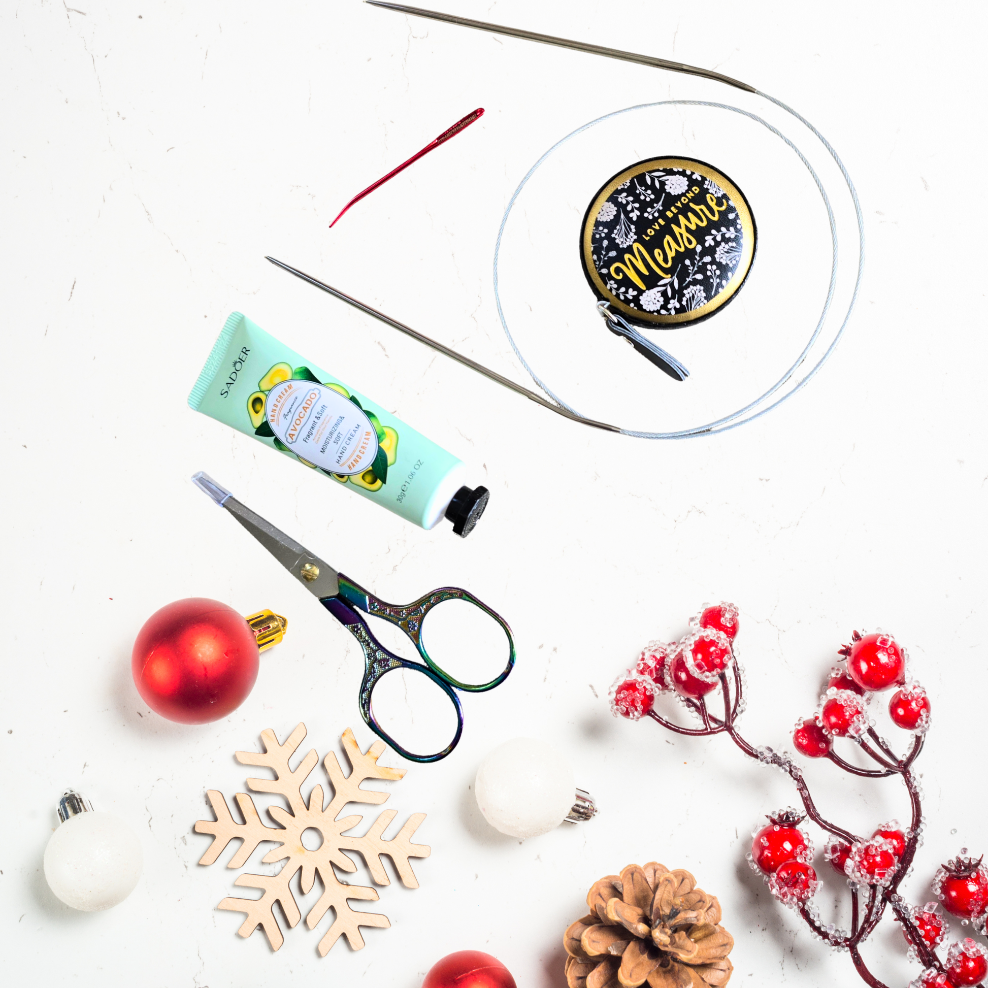All-in-One Colorwork Toolkit – Everything you need for your next colorwork project, including sharp scissors, a retractable tape measure, circular knitting needles for stranded colorwork, a tapestry needle, and soothing hand cream.