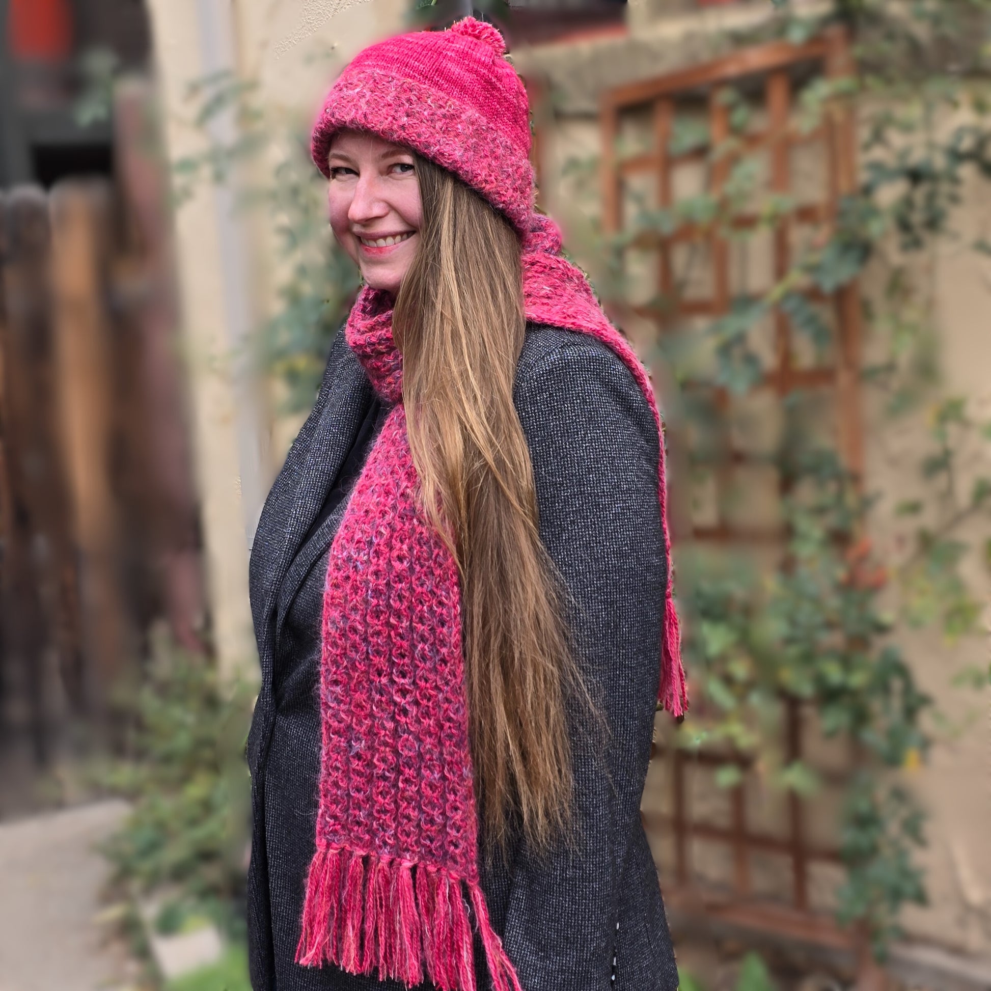 - Our Model is wearing the Sophia hat and scarf -- the scarf and hat brim are made from carrying one strand of Simatri along with one strand of Halo Watercolors.