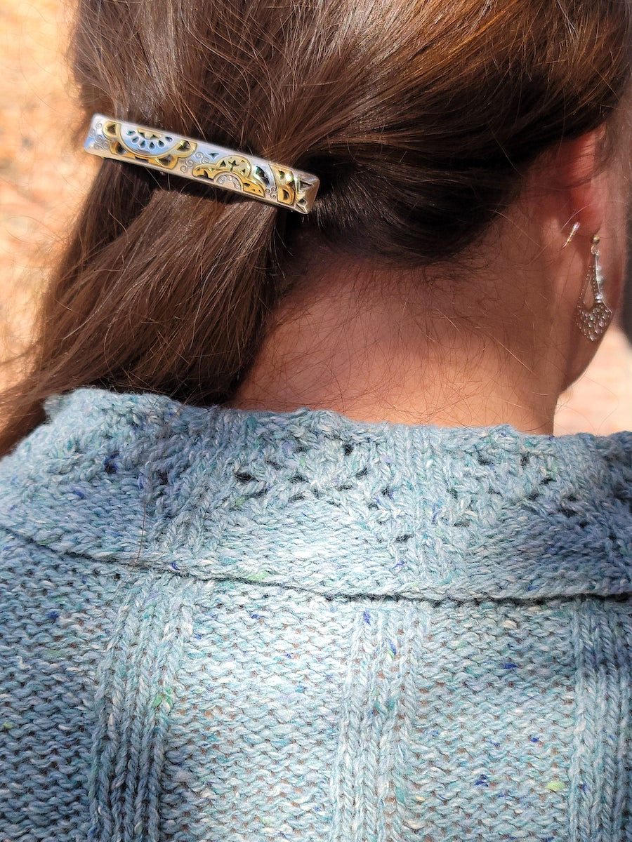 Arranmore Light (DK weight) from the Fibre Co was chosen both for it's subtle tweediness and it's soft drape. The sweater is worked in an asymmetric rib pattern which flows into a lacey finish at sleeve cuffs and below the waist on the body of the sweater. The same lace detail is picked up on the folded neck banding. Although you may also wish to work up a swatch of the lace, be sure to use the gauge you get for your blocked ribbing swatch for the lace also, so that the ribbing flows into the lace.